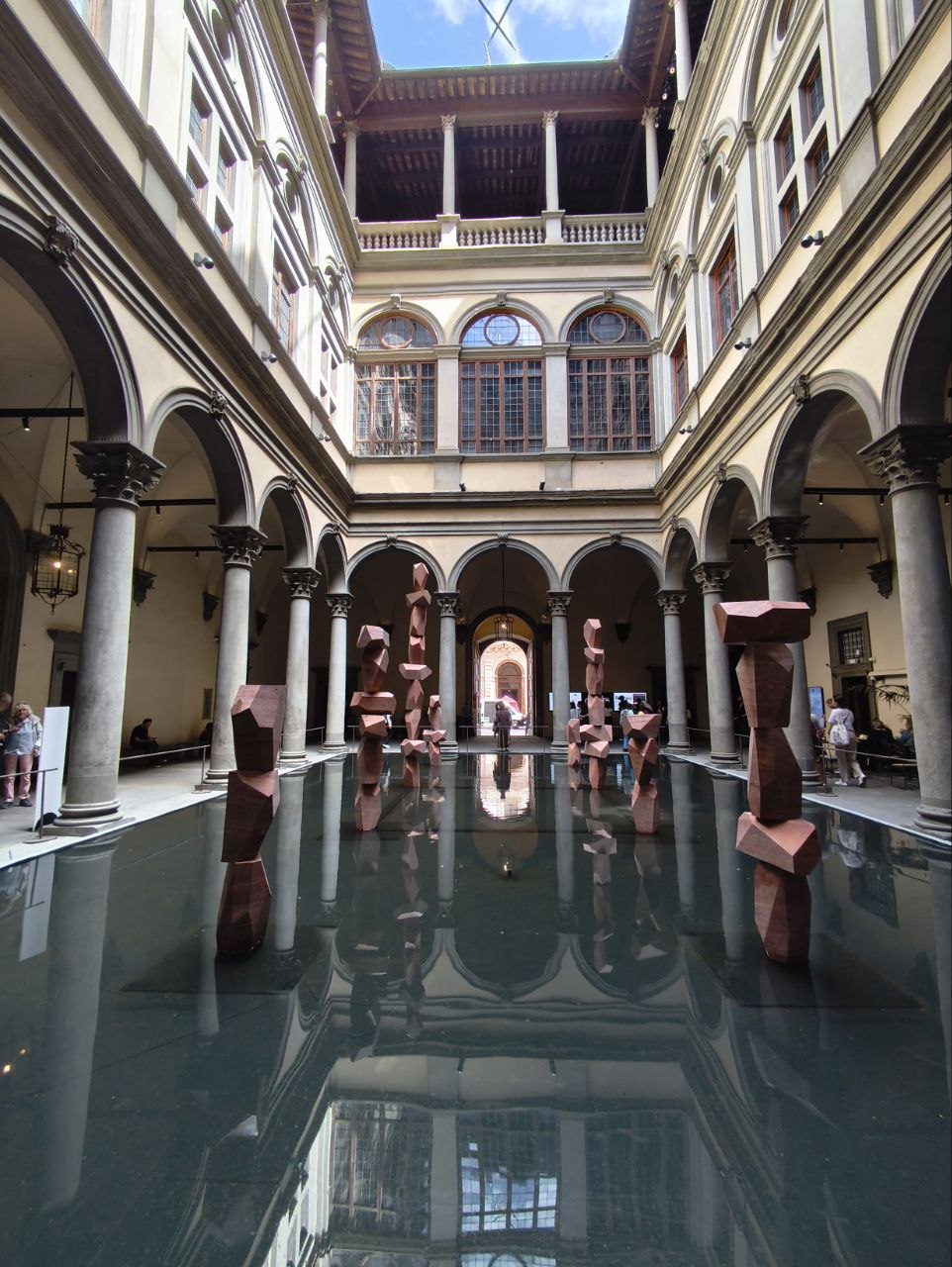 Внутренний двор Палаццо Строцци — это символ ренессансного порядка и человеческого контроля над пространством. Когда туда помещают воду - архитектура начинает отражаться и "размываться", твёрдое превращается во временное и нестабильное.