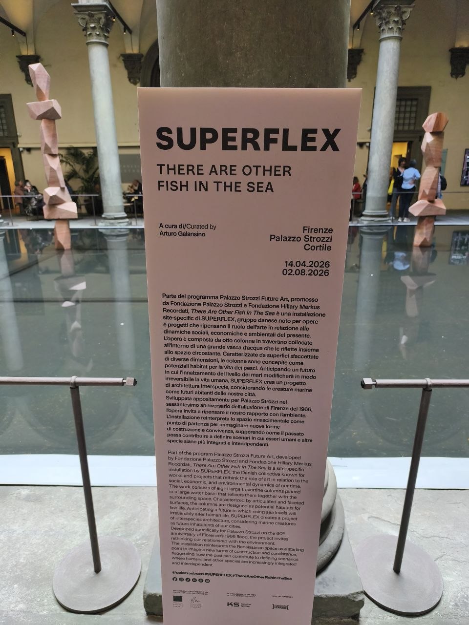 "There Are Other Fish In The Sea" - это временная инсталляция, сделанная специально под пространство Палаццо Строцци. Ренессансный двор буквально превращен в водную среду. Бассейн с водой отражает архитектуру, из воды "вырастают" розовые колонны из травертина. У этой работы несколько уровней прочтения и они угадываются только если смотреть глубже.
